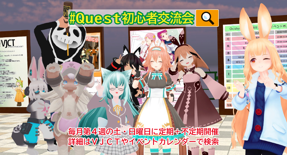 参加方法:「にゃ~の♪」または要日本語手話であれば mimikun(出席時のみ)にjoin。 趣旨:VRChat初心者同士や初心者との交流のために、Questに対応したアバターとワールド(土曜日はCafe Qのpublicインスタンス、日曜日は無言勢にも配慮したワールドで毎週別のワールド)で行うイベントです。 参加要項:Questから見ることのできるアバターで参加することのみ。Quest以外の人も参加オッケー! 特色:インスタンスマスターの他に人の輪に入れない人を出来るだけなくすようにパーティーホスト役を置きます。基本無言勢でも楽しめるイベントを目指します。またカメラ撮影オンリーのスタッフも巡回しています。日本語手話が必要なユーザさんがおられましたら 目指す理想:初心者はもちろんそうでない人もスタッフも楽しめるイベントで、大学の新入生歓迎会+各部活の発表会と勧誘みたいな感じで、VRChat内でのQuest対応イベント主催者やあらゆる活動をしている集団、個人の発表や宣伝、勧誘などの場としても使っていただければ幸いです。 スタッフ常時大募集!:スタッフを常に募集しています。日本語での意思疎通が文字できるなら能力は一切問わず、気軽に欠席したり寝ながらでもスタッフ出来るような最も意識の低い運営をするために沢山の人員を要します。インスタンスの中にいて時折連絡をDiscordでするだけの簡単な仕事から、人と積極的に話す仕事まで、VRCの他のイベントでも役立つスキルを0から覚えられるようにいたします。今後他のイベントのスタッフをやってみたい方、主催をしてみたい方も是非ここから始めてみませんか? 主催者にフレリクを飛ばすリンク:https://t.co/qAZL4zBQzk?amp=1 |